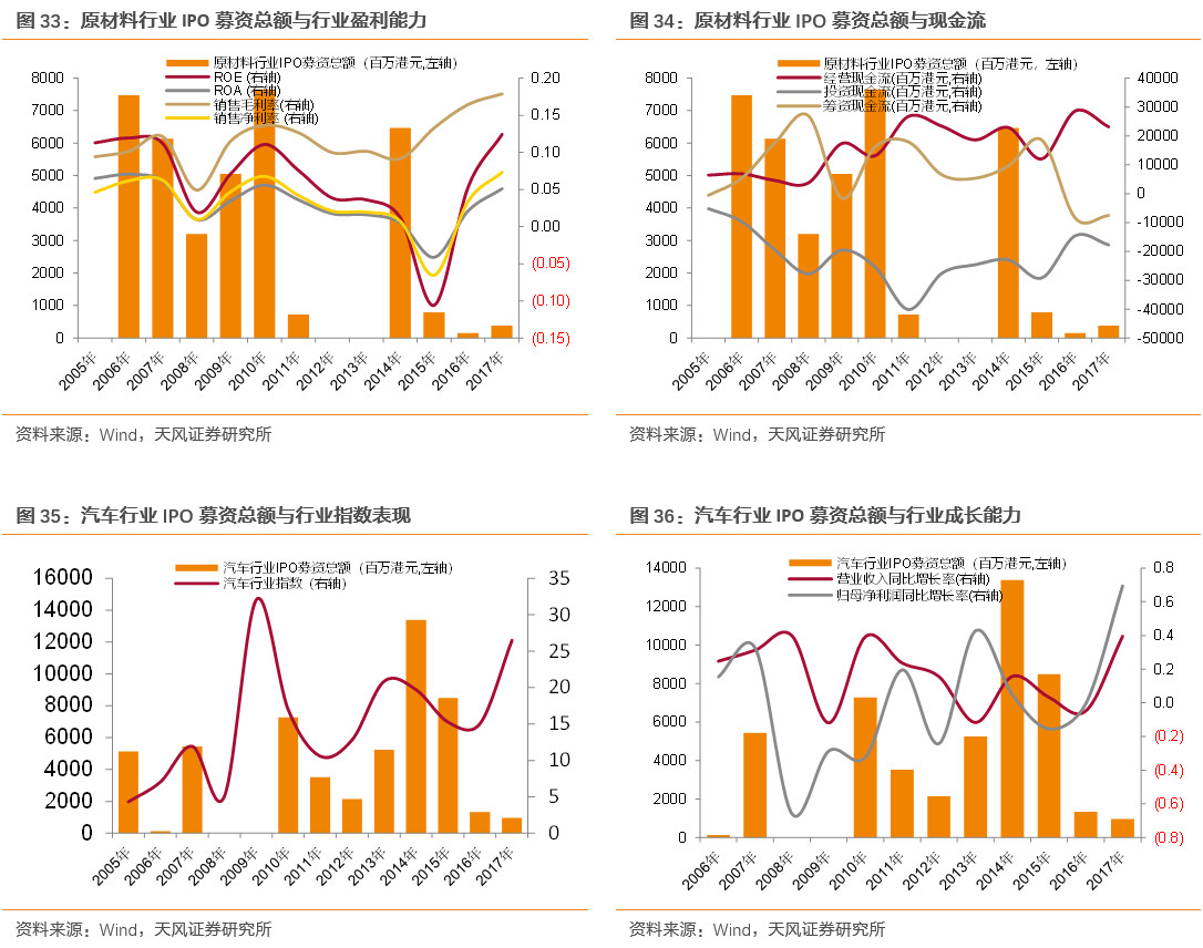 目前大部分周期型行业IPO募资总额处于历史较低水平,同时伴随着成长与盈利能力指标的短期改善。这一方面表明经济结构的转型,另一方面也表明行业现在并非处于过热阶段。