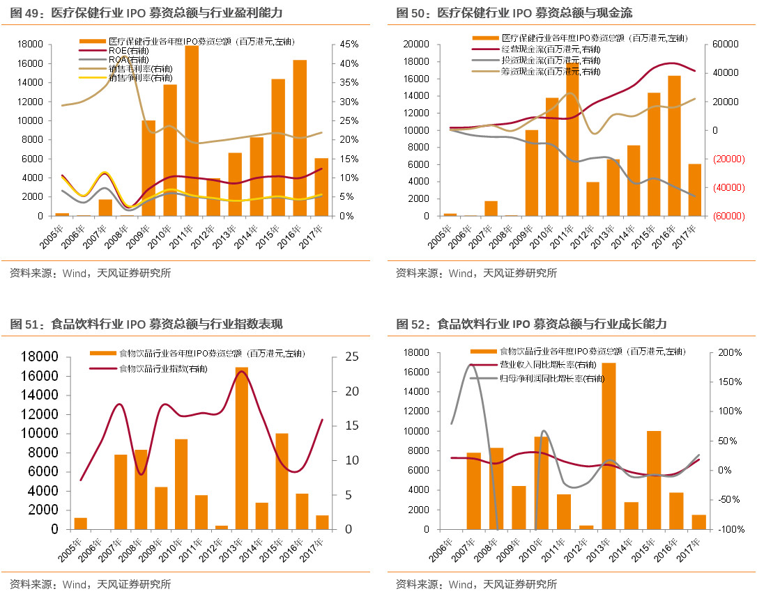 比较各行业指数可见,虽然稳健型行业大多IPO募资总额大幅上涨时行业指数也随之攀升,但振幅远弱于周期型行业。此外,稳健型行业指数普遍在2015年以后迎来上涨行情,IPO可能只是其大行情波动的辅助因素,在局部行情中反而更明显。在所涉及的恒生二级行业中,食品饮料行业指数波动与IPO相关性最为显著,但也不排除食品饮料IPO募资高点恰好与15年后行业上涨行情相重叠。此外,16年以后稳健型行业IPO与行业指数表现的相关性显著弱化,贡献度大幅下降。