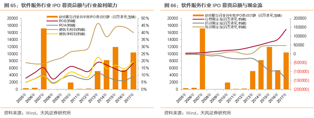 对比行业成长能力及盈利能力指标,我们发现成长型行业类似周期型行业,IPO与行业景气指标的相关性十分显著。具体趋势来看,成长型行业IPO募资总额与其主要的成长及盈利能力指标表现出明显的正向波动趋势,IPO募资总额的见顶往往对应着企业成长和盈利能力的下行,行业增长放缓,景气度回落。其中,资讯科技器材业、软件服务业均明显表现出这一特点。